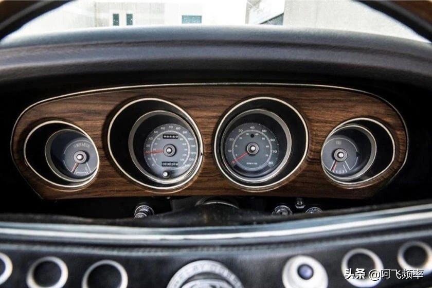 车内,能看见的大多数部位都被黑色真皮包裹一如既往的美式风格,三辐式方向盘上有熟悉的Shelby(谢尔比)“眼镜蛇”标志,后面是140英里(约合225公里/小时)表底的时速表,多媒体系统相当简单,毕竟这是一辆快五十年的车了,中控台上使用了Clarion(歌乐)的主机和Pioneer(先锋)的八扬声器。