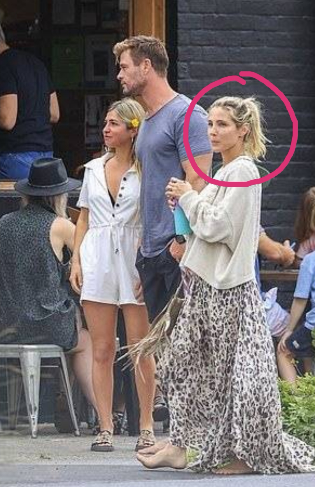 在逛街途中,克里斯·海姆斯沃斯还被粉丝偶遇,他非常接地气的接受了粉丝的合影要求,在与女性粉丝合照的时候,克里斯·海姆斯沃斯显得更像是一个巨人,双手插兜保持着适当的距离。丈夫和女粉丝合影的时候,锤嫂站在一旁,表情略显尴尬,眼睛也看向别的地方,并没有盯着镜头。